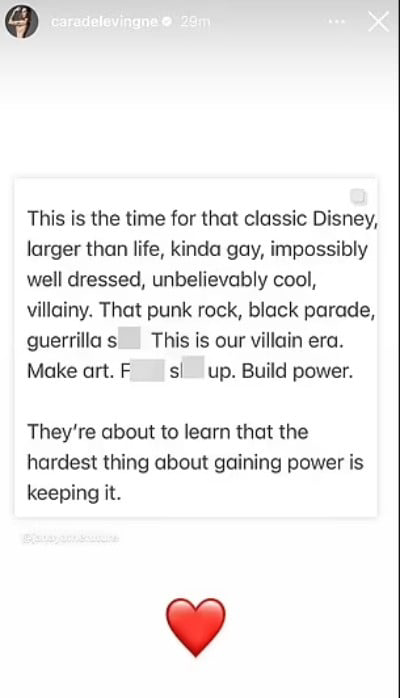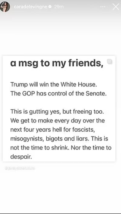 Delevingne passionately called on her friends and peers to commit to making the next four years of Republican rule “a living hell.”