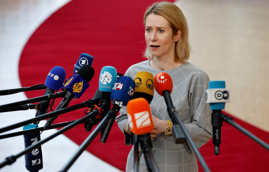 EU High Representative for Foreign Affairs and Security Policy and Vice-President of the European Commission, Kaja Kallas speaks to the media as she attends a European Union leaders special summit to discuss Ukraine and European defence