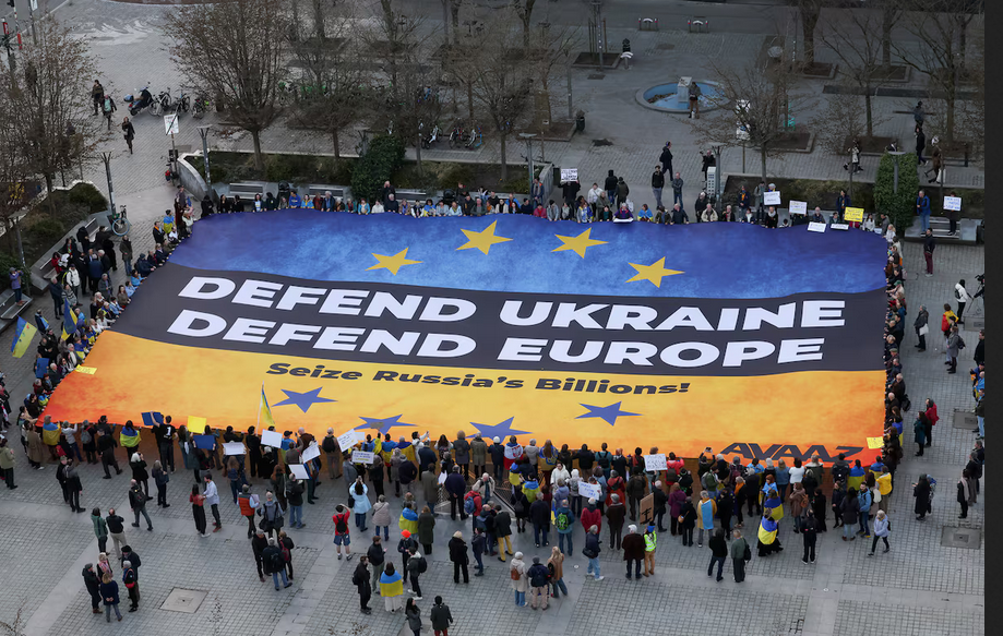 Ukrainian activists deploy a massive banner, urging European leaders to seize frozen Russian assets to fund Ukraine in its conflict against Russia, in Brussels Belgium, March 5, 2025. REUTERS/Yves…