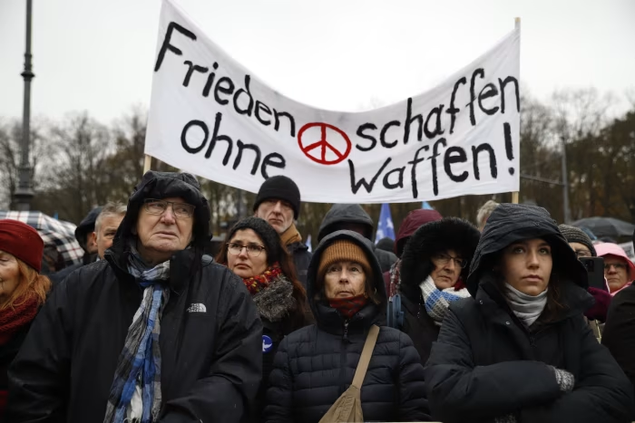 People hold up a banner that says ‘Make peace without weapons’ during an anti-war demonstration in Berlin in 2023 © Paul-Louis Godier/AFP/Getty Images