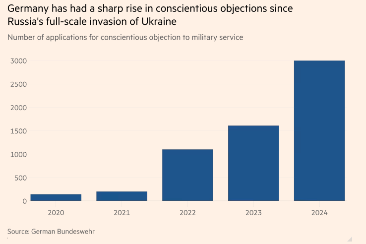 Since Russia’s full-scale Ukraine invasion, Germany has had a steep rise in the number of conscientious objectors (including both regular soldiers and part-time reservists). The figure reached 2,998 last year — up from 200 in 2021.